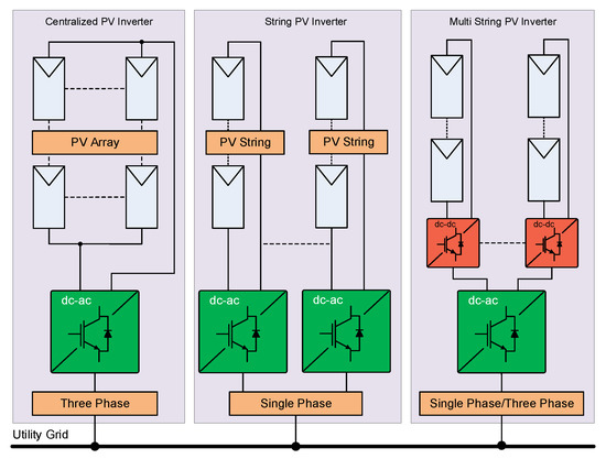 The most important issues in the improvement of solar inverters are related to efficiency of MPPT algorithms, decreasing the overall cost, improving the power density regarding size and volumes, and ensuring the isolation. The recent solar inverters are configured without galvanic isolation by removing the bulky line frequency of high frequency transformers, but assembling with capacitive isolation at the PV array connection. Another recent improvement in solar inverters is provided by MPPT algorithms that are capable of coping with partial shading situations [13,14]. Figure 1 represents a set of PV inverter topologies of centralized, string and multi-string configurations. The first topology is convenient for connecting high number of solar arrays to a single inverter which operates as a centralized power converter and interfaces the highest power rate among others. Although the centralized inverter is capable of converting the obtained power of solar arrays, it lacks in MPPT efficiency since the limited number of tracking inputs are available in the inverter configuration. The second topology seen in Figure 1 is improved as a solution to decreased MPPT efficiency of the centralized inverter where many string inverters are used to interface solar arrays, and the number of MPPT algorithms is increased. Thus, the limited number of controllers in a centralized inverter is tackled, and increased MPPT controllers in a string inverter provides more successful tracking capability. The string inverters are comprised by single-stage or two-stage where the latter is built with a boost converter that ensures to obtain higher values of dc-bus voltage before the inverter section. The last configuration provides an increased number of boost converters in a solar plant due to the architecture of a multi-string inverter. The voltage level of dc-bus is adjusted by many boost converters to ensure obtaining a stable dc voltage level. Moreover, the advantages of centralized and string inverter topologies are combined in multi-string inverters due to increased number of MPPT controllers and robust dc-bus voltage which enables the smooth conversion at the inverter section [12].