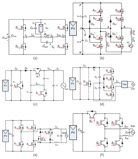 Single phase solar inverter configurations, (a) single-stage structure [19], (b) single-stage H-NPC [20], (c) common-mode transformerless [17], (d) boost converter+NPC two-stage [11], (e) two-stage highly efficient and reliable concept (HERIC) inverter [18], (f) H5 inverter [18].