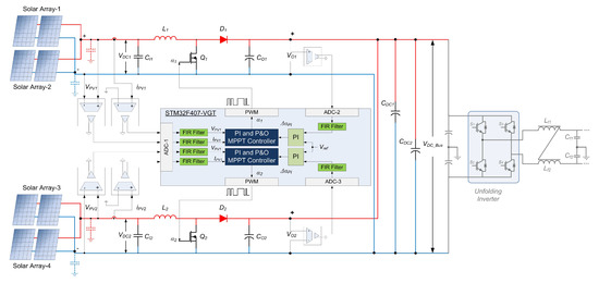 An STM32F407 microprocessor that is one from the 32-bit ARM family manages the control operations. Each boost converter includes a hall-effect current sensor to track PV currents while resistor networks perform the voltage sensing of capacitors at the input and output of the converter. The sensed values are supplied to analog-digital converter (ADC) ports of the microprocessor by the signal conditioning circuits that are composed of isolation amplifiers. In other words, each boost converter provides three measurement signals to the microprocessor that are PV current, input capacitor voltage, and output capacitor voltage. Although the signal conditioning circuits include passive low-pass filters, the acquired signals are filtered by a software-based finite impulse response (FIR) filter in the microprocessor. Once the inherited digital signals are filtered, input measurements are transferred to the P&O section, and output capacitor measurement is applied to the PI controller as illustrated in the block diagram. The control algorithm is dependent on three input signals obtained from a hall-effect sensor for current and resistor networks for voltages. Therefore, the additional circuit required for the control algorithm is achieved with a low-cost design. The design studies are presented in two sections, one is on data acquisition and signal conditioning networks, and the other one is on the control algorithm.