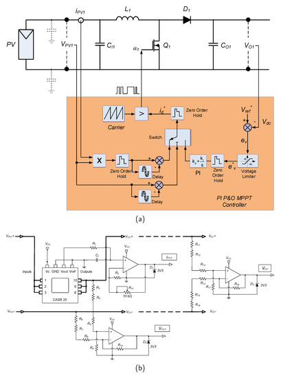 The control algorithm requires a data acquisition interface transmitting the measured signals to the microprocessor. The measurement points at the boost converter, as shown in Figure 4a, inherit the input parameters that are involved in the control algorithm, and the signal conditioning circuit is designed as presented in Figure 4b. The input capacitor is responsible for mitigating the switching ripples that cause fluctuations in inductor current and ensures achieving an average current flow along with the inductor. The input capacitor and inductor share the current provided by solar array that is shown as with respect to the Kirchoff’s current law as follows;