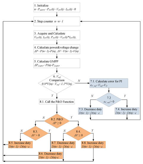 Figure 5 shows the flowchart of the proposed PI P&O MPPT algorithm where the main program consists of two subroutines as PI and P&O functions. The initial step sets counters and registers instant power, instant voltage, instant current, and MPPT power to zero in Step 1. In the next step, the counter is increased by one and then MPPT calculations get started in Step 3. The voltage and current of PV, and the output voltage with the parameter are acquired, and PV power is calculated in Step 4. After storing the values, the algorithm compares the actual voltage and current with previously stored values for detecting power fluctuations. The measured PV power is compared with previous global MPP, and change in GMPP is detected in Step 5. The measured output voltage is compared with a reference boundary in Step 6 where the program jumps to the P&O function if the achieved voltage is not higher or lower than 90% or 110% of the desired output voltage. This operation is accomplished by the multiport switch seen in the orange block of Figure 4a. The switch is driven by the middle port connection which triggers the main program for calling PI or P&O subroutines. Once the achieved output voltage gets out of the boundary band, then the program calls the PI control subroutine starting from Step 7.