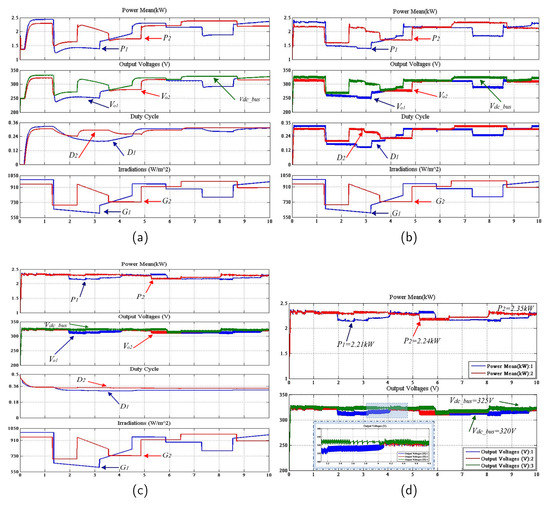 The presented figures show that the highest voltage of any converter supplies the output voltage where voltage oscillation reaches up to 80 V in the second interval covering seconds of simulation. The proposed MPPT controller satisfactorily tracks the irradiation changes and shifts the operation mode between the P&O and PI controller in the case of exceeding the predefined hysteresis band. This operation mode control is shown in the presented simulation results of Figure 6c that the output voltage of the dc bus is limited around the 5 V hysteresis band. The detailed view of output voltage fluctuations and power rates has been presented in Figure 6d. The output power of solar arrays is measured around and kW at various operation intervals where the rated total power of solar arrays is kW. Once the operation conditions and prototype optimizations have been carried out in simulation studies, the proposed MPPT method has been experimentally investigated. The test rig has been installed referring to simulation parameters and converters have been configured with calculated values.