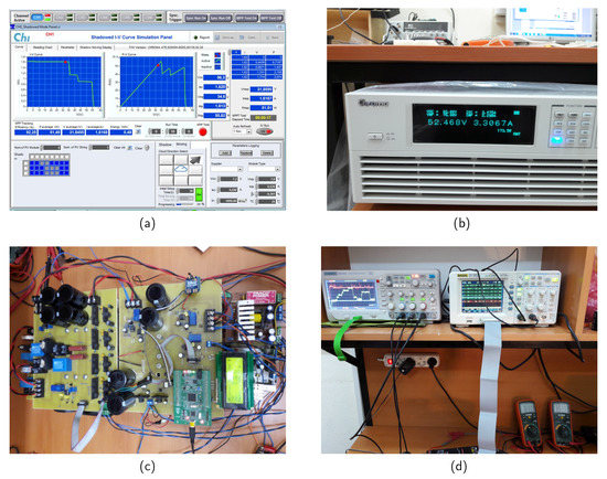 Hardware and setup used in experimental studies, (a) solar array simulator (SAS) interface for partial shading configuration, (b) Chroma 62050H-600S SAS, (c) dual boost converter, (d) measurement system.