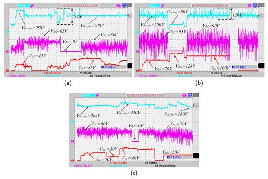 The experimental study results have been shown in Figure 8 and Figure 9 where each scope screen depicts 375 s of measurements (time/div = 25 s in Figure 8b, time/div = 50 s in Figure 8a,c). The second channel of scope (, 50 V/div) presents the first solar array input, third channel of scope (, 50 V/div) presents the third solar array input, and fourth channel (, 100 V/div) denotes the dc bus voltage of the converter. Figure 8 shows experimental results of the dc converter that is controlled by the PI controller, InCon MPPT, and P&O MPPT, respectively, in Figure 8a–c.