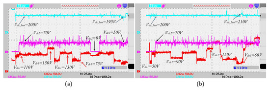 The dc input voltages have been applied as a dual solar array as seen in Figure 8a. Although the PI controller provides stable operation during a single supply, it was not capable of tracking the desired reference voltage when both of the solar arrays were operated simultaneously or at different times. The overshoots or dips of output voltage have been extended up to 40% of the reference, as depicted in Figure 8a. On the other hand, the settling time takes around to stabilize the desired output when one of the sources is stopped to provide supply . The step time causes fluctuations on dc supply while InCon algorithm searches and tracks the MPP as seen in Figure 8b. The reference error is measured around 10% to 20% according to single or dual supply conditions. On the other hand, the output voltage oscillations reach up to during InCon MPPT control. Another comparison of the proposed algorithm has been carried out with regular P&O MPPT where Figure 8c shows the experimental results. In the case in which both inputs are supplied, the oscillations on the second input have been decreased as seen in Figure 8c, where the output voltage fluctuations sustain and the obtained output cannot track the desired reference voltage satisfactorily. Although the response time of P&O MPPT is lower than the InCon algorithm, it takes around to track the input voltage. Moreover, the reference error of the P&O algorithm has been measured as 5% referring to experimental results seen in Figure 8c.