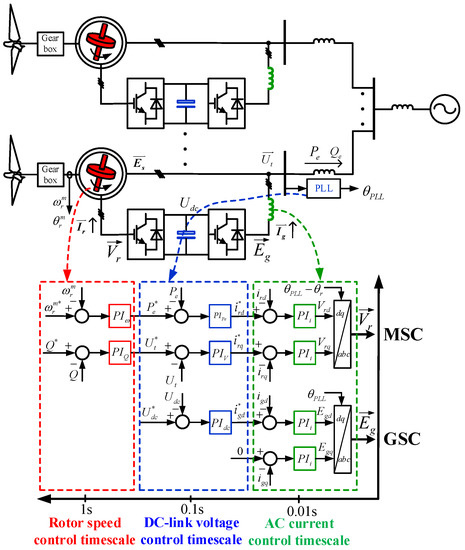 As depicted in Figure 1, the vector control of a DFIG is hierarchically formulated, and referring to [15], the associated dynamics can be classified into three layers, namely, the rotor speed control timescale (1 s), the DC-link voltage control timescale (0.1 s) and the AC current control timescale (0.01 s). The dynamics of the rotor speed control timescale are close to the electromechanical dynamics of the power systems, since its time constant is close to the synchronous generator’s inertia constant. For the typical vector-controlled VSCs in wind turbine applications, the control bandwidths of the inner current control loops of the RSC and GSC are around 100 Hz, while the outer control loops are usually designed to a decade slower [21], around 10 Hz. Generally, the RSC controls the total active power sent to the grid, as well as regulating the reactive power to maintain the terminal voltage around the nominal value. By contrast, the GSC is responsible for controlling the DC-link voltage, keeping it around the rated value. Besides, unity power factor control is normally adopted by GSC. The frequency range of dynamics covering the outer control loops, such as the GSC DVC, the PLL, the RSC active power control and the terminal voltage control, are defined as the DC-link voltage control timescale dynamics [15].