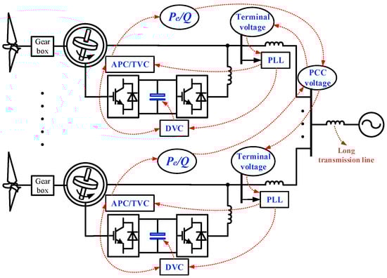 The interactions of multi DFIGs in the DVC timescale under weak grid conditions can be complicated. As shown in Figure 2, when the AC transmission line is long, the bus voltage at the PCC, as well as the DFIGs’ terminal voltages, will become sensitive to disturbances from both the wind turbine side and the grid side. On the one hand, the DC-link voltage control, the PLL, the active power control and the terminal voltage control will interact with each other through the coupling of terminal voltage dynamics in a single DFIG, due to their close control bandwidths. On the other hand, the variations of the output powers of each DFIG will affect the PCC voltage and the terminal voltage of other DFIGs, considering the circuit power flows; in turn, a change of terminal voltage can drive the DVC control actions of other DFIGs, as well as altering their output powers. Consequently, multi DFIGs also interact with each other in the DVC timescale. Under weak grid conditions, the terminal voltage of a DFIG and the PCC’s voltage are more sensitive to the wind turbine’s power variations; therefore, the weaker grid condition will aggravate the DVC timescale interactions among multiple DFIGs.
