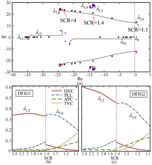 However, with the SCR reduced to a certain low level, i.e., SCR < 1.4, another pair of complex modes, λ5, 6, sharply moves towards the right half of the plane and becomes the dominant mode, even crossing the imaginary axis when the SCR approaches 1.1. The participation factor curves in Figure 5b,c show that this mode is mainly participated in by the PLLs of the two DFIGs. Therefore, it can be concluded that the interactions of the PLLs of the two generators play a leading role in the stability of weak-grid tied multi-DFIG systems. Additionally, when the SCR is around 1.4, the locations of λ1, 2 and λ5, 6 are very close in the complex plane, and it can be found that both the DVC and PLL have high levels of participation in the two modes; by contrast, when λ1, 2 and λ5, 6 are separated in comparably high or low SCR conditions, the participation degree of the PLL in λ1, 2 and that of the DVC in λ5, 6 become smaller. This result implies that the close interaction between the PLL and the DVC comes under the condition that their related modes are locate close together in the complex plane. Indeed, this phenomenon is known as near modal resonance [29,30], where two eigenvalues located close together in the complex plane will significantly interact with each other, and a slight change of the system parameters could possibly induce a large damping variation in one of the two modes, as well as enlarging the risk of instability. The results of the eigenvalue locus and related participation factor curves in Figure 5 confirm this general phenomenon.