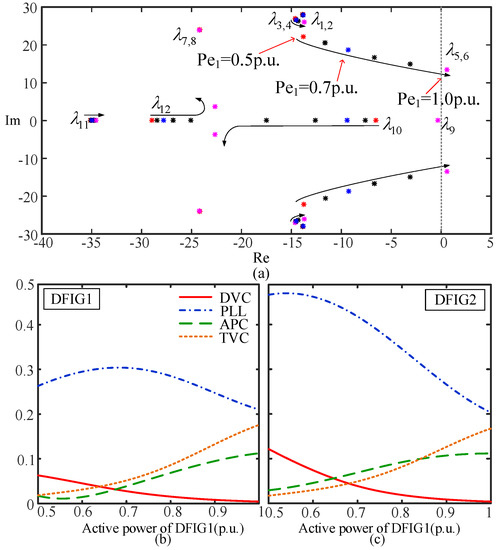 In this subsection, the effect of the operating points on the stability of multi DFIGs is studied. In this case, active power outputs of DFIG2 are set to 2 MW, and the SCR is fixed at 1.1. The eigenvalue locus for DFIG1′s output powers varying from 0.5 p.u. to 1.0 p.u. is depicted in Figure 6a. As the active power output of DFIG1 increases, similarly, the dominant eigenvalues λ5, 6 move toward the right half of the plane, and migrate into the unstable region, until Pe1 = 1.0 p.u. Likewise, participation factor analyses in Figure 6b,c imply that the PLLs occupy the largest participation share of this mode. Besides, the participation level of the RSC APC and the TVC also grow with Pe1‘s increase. The analysis shows that heavy loading is detrimental to the stability of a multi-DFIG system with weak grid connection.