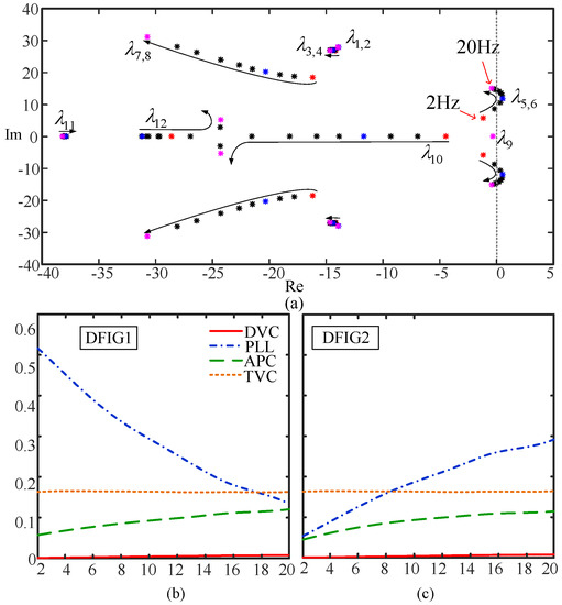 in which and are the kth entry of the right and left eigenvectors, respectively. The participation factor, as expressed in Equation (40), is an index which can weigh the relative participation level of the kth state variable in the ith mode. For a normalized eigenvector, the sum of the participation factors to a mode for each state variable is equal to unity. Besides, the dynamics of a state variable corresponding to a mode are usually linked to the associated controls, for instance, DC-link voltage greatly affects the dynamic of DC-link voltage. Therefore, different controls’ relative impacts on one mode can also be quantified by the participation factor. In addition, as the participation factor is calculated from eigenvalues and eigenvectors, its value also changes with system operating condition variations. So, in the following, along with the eigenvalue locus, the participation factor curves under different conditions will be drawn to determine the closely-related controls of the system dominant mode.