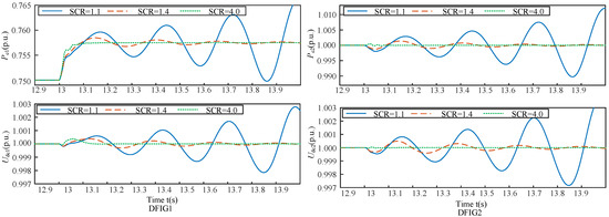 The effect of grid strengths on stability of this system is studied first. Grid strength is measured by SCR. The active power outputs of DFIG1 and DFIG2 are set to 1.5 MW and 2 MW, respectively. The eigenvalue locus for SCR changing from 4 to 1.1 is given in Figure 5a, and the participation factor curves on system dominant mode for different controls in DFIG1 and DFIG2 are depicted in Figure 5b,c. It can be observed that, when SCR > 1.4, the real part of λ1, 2 lies closest to the imaginary axis; therefore, λ1, 2 is dominant when grid strength is relatively stiff. This mode hardly changes with SCR variations. The participation factor curves for SCR > 1.4 reveal that this mode is mainly participated in by the DVC-related state variables. Since the output power of DFIG2 is larger than that of DFIG1, the participation level of DFIG2 is also relatively higher.