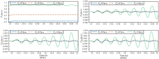 In this section, detailed model-based time domain simulations are carried out to verify the analysis given in Section 4. A two-DFIG system in connection with a weak grid system model is built in Matlab/Simulink. The main structure of the DFIG model is inherited from the demo model in Simulink [28], and as this paper focuses on converter electromagnetic dynamics, the mechanical part, including the turbine and related controls, in the demo model is abandoned, and constant power/voltage references as converter control inputs are assumed (See Figure 1). Additionally, compared to the proposed reduced-order model, the detailed simulation model includes the dynamics of current controls, the generator and the network circuit. The model’s parameters and operating conditions are set to be the same as those in the case studies given in Section 4 for comparison. For all the simulation scenarios, the system reaches a steady state before t = 13 s; then, a small disturbance, i.e., a 0.5% step-up increase of the active power reference in DFIG1, is enacted at t = 13 s, and the responses of DC-link voltages and the active powers of the two DFIGs are captured.