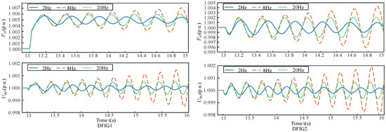 Figure 8 shows the simulation results for different grid strength conditions. The DC voltages and active powers of the two generators oscillate with the decrease of SCR, which indicates that the system stability deteriorates with the reduction of grid strength. This tendency is in accord with the eigenvalue locus given in Figure 5a. In addition, Figure 8 shows that sustained oscillation happens at SCR = 1.1, and this also strongly agrees with the analysis given in Figure 5a, where the poles move to the right-half of the plane at SCR = 1.1. Figure 9 gives the simulation results for different output powers of DFIG1. Similarly, it reveals that system stability is reduced with the increase of the loading level, and a loss of stability even happens when the power outputs of DFIG reach 1 p.u. This result is also in good agreement with the analysis given in Figure 6a. Figure 10 shows the simulation results for different PLL bandwidths. As analyzed in Section 4.4, the worst stability condition comes when the bandwidths of the PLLs in the two DFIGs are close. This conclusion is also validated in the simulation results given in Figure 10; with the increase of the PLL bandwidth in DFIG1, the system first becomes unstable after DFIG1′s PLL bandwidth reaches 8 Hz, then it restores stability when DFIG1′s PLL bandwidth further increases to 20 Hz. This is because the difference between the bandwidths of the two PLLs first decreased, then grew, during this process. Overall, the simulation studies verify the correctness of the eigenvalue analysis given in Section 4.