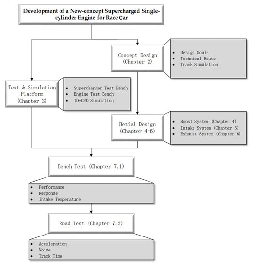 This paper is divided into eight sections. Section 1 is a brief introduction of the background of this research. Section 2 sets the goal of the powertrain system developed in this study and puts forward the technical route of the single-cylinder engine under the response enhancement technology system with supercharging as the core. Section 3 introduces the simulation model and test bench used in this paper. In Section 4, the engine 1-D CFD simulation was carried out in order to select and match the supercharger, and the intake bypass valve was designed separately. In Section 5, StarCCM+ [13] was used to simulate the intake system, and the influence of intake restrictor and the upstream and downstream volume of throttle on the response performance was mainly studied. In Section 6, the “expansion chamber + main muffler” series exhaust system is proposed. In Section 7, the engine performance test, road test and other tests are carried out to verify the design results. Section 8 is the summary of this development and research. The overall structure of this article is shown as Figure 3.