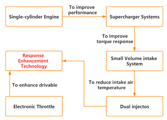 To achieve the design goals mentioned above, a technical route called ‘response enhancement technology’ is designed as shown in Figure 4. The technical route takes a single-cylinder engine as the base and has the following technical characteristics: a supercharging system, a small-volume intake system, a dual-stage fuel injection and an electronic throttle system.
