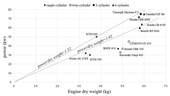 Twelve engines with a displacement of 350–710 mL that follow the Formula Student rules have been selected, including 4 four-cylinder engines, 1 three-cylinder engine, 3 twin-cylinder engines and 4 single-cylinder engines. According to the dimensions of the stock power and the engine dry weight, a scatter diagram is shown in Figure 5.