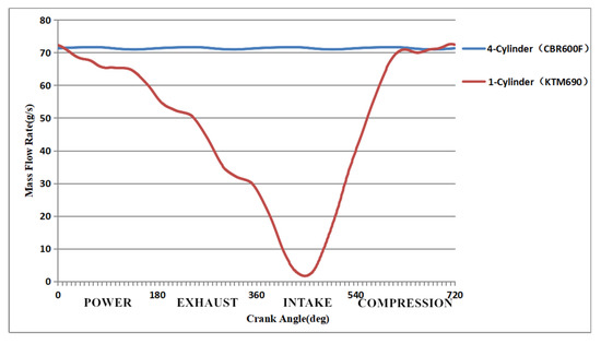 When a natural aspirated engine has an intake restrictor, the mass-flow unevenness of the single-cylinder engine at the restrictor will be much higher than that of a multi-cylinder engine due to the pressure fluctuations in one working cycle, and the air flow rate can only reach the limited extreme value for a small part of the time, as shown in Figure 6. Macroscopically, the flow of the naturally aspirated single-cylinder engine at the restrictor is always underutilised.