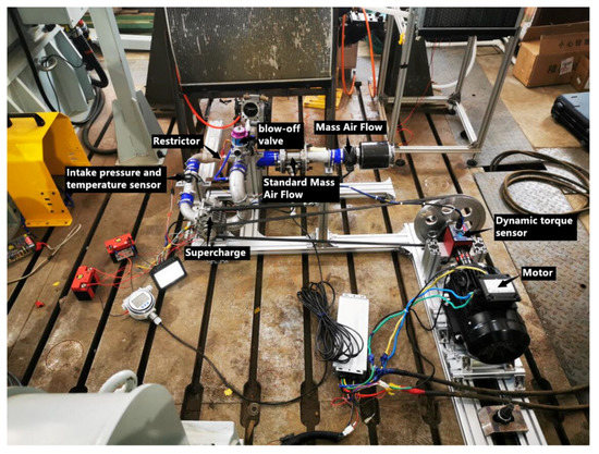 To determine the volumetric and thermal efficiencies of the supercharger, a test bench for supercharger characteristics was designed and built in the research process, as shown in Figure 9.