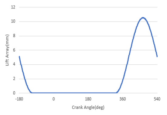 The GT-Power software [23] was used to build a One-Dimensional Computational Fluid Dynamics (1D CFD) simulation model of the stock engine. The model structure is shown in Figure 11. In the model, the intake and exhaust system, the cylinder, the crankshaft, the rotational inertia etc., are set according to the stock engine; the air–fuel ratio of the power mixture was 12.8:1 [24]. The valve lift curve, the diameter and the rod diameter were used as input based on the actual measurement results. The intake and exhaust valve lifts are shown in Figure 12 and Figure 13, respectively. The combustion model uses a dual-zone Wiebe combustion model [25]. Mechanical loss is used in D. E. Winterbone’s empirical formula for calculation [26]. To facilitate the subsequent calibration and verification of the model, the model does not reflect the air intake limiter required by the rules. The 1D CFD model of the stock engine was analysed and calculated, and the simulation results were compared with the dyno-tested result as shown in Figure 14. After the parameter calibration, the simulation and test results exhibited good agreement and a small error range.