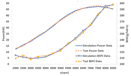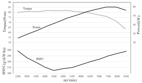 The test results show that the maximum power was 60 kW (7500–8000 r/min), and the maximum torque was 82 Nm (2500–6500 r/min). The BSFC at full load was less than 300 g/kWh, and the minimum BSFC could be 265 g/kWh. The high torque range (>90% max torque) was from 2000 r/min to 7500 r/min, which corresponds to 65% of the maximum engine speed. The dry weight of the engine assembly was 54.5 kg. The above indicators achieved the design goals.