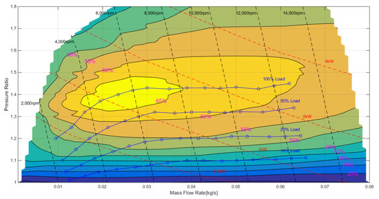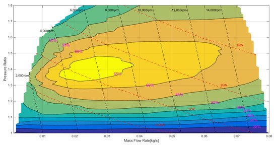 The test bench was driven by a DC motor. The speed and mechanical power of the supercharger were measured by a noncontact speed/torque sensor, and the air mass flow was measured by a hot-film air-flowmeter. Temperature and pressure sensors were arranged upstream and downstream of the supercharger to calculate the pressure ratio and the thermal efficiency. In addition, an adjustable blow-off valve was also installed downstream of the supercharger to adjust the different target pressure ratios. The output signals of each sensor were logged by a MOTEC C125 [22] data acquisition device. Table 6 presents the specification of the test bench.