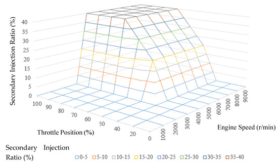 After supercharged modification, the stock fuel injector may not have the capacity to provide the larger fuel flow rate. Once a large injector is installed, the injection pulse width at idle or light load will be quite low (even less than 1.5 ms); thus, the injection control accuracy will deteriorate [18,19]. Therefore, this study used dual-stage fuel injection to compromise the fuel flow rate at high load and the control accuracy at low load.