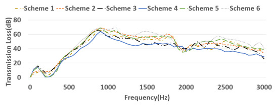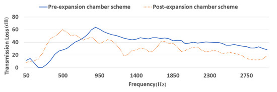 The soundwave at 5500 r/min was collected after warm-up, and spectrum analysis was performed, as shown in Figure 48. In general, the characteristic frequencies of the testing and simulation noise are in good agreement. Below 450 Hz, the measured amplitude was very near the simulated amplitude. However, because intake noise, mechanical noise and chassis vibration cannot be achieved by the 1D CFD simulation at frequencies above 450 Hz, the simulated amplitude was lower than the measured amplitude.