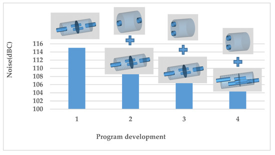 The exhaust system of the engine is designed with the goal of noise level reduction and power output increase. In the study, an exhaust system configuration with a pre-expansion chamber and a rear main muffler is proposed to reduce the low-frequency noise in the expansion chamber and the high-frequency noise using the main muffler. Through parameter optimisation and design iteration, the volume of the expansion chamber and the structure of the main muffler are gradually adjusted. The target power is achieved at a noise level under the rule limits.