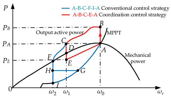 In the conventional frequency control strategy, the DFIG will exit frequency regulation and recovery to the maximum power point A when the rotor speed decreases to . Different rotor speed recovery strategies were proposed in [28,29,30] including the delay recovery strategy, the switching control parameter recovery strategy, and the fixed output power recovery strategy. In these strategies, the DFIG either adopts F–I–A (blue curve in Figure 3) as the tracking curve of the rotor speed and output power or takes F–H–G–A as a tracking curve. F–I–A curve directly selects the MPPT curve as the reference value of output active power. The F–H–G–A curve maintains at H point for a period of time and then takes the MPPT curve as the reference value. However, they both have the problems of output active power dip and output active power loss.