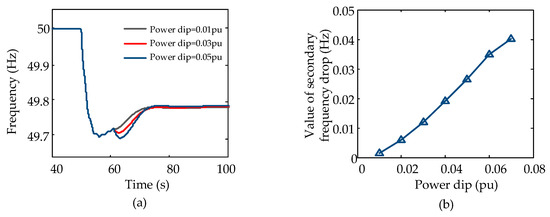 Secondary frequency drop under different power dip: (a) System frequency under different power dip; (b) Relationship between power dip and secondary frequency drop.