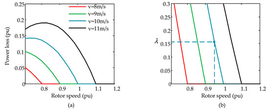 When wind speed is determined, the output active power loss Ploss is a function of rotor speed and the power loss under different wind speeds can be calculated according to (8). Aside from the power loss percentage , that is, the ratio of the output active power loss and DFIG real output active power, can also be obtained.