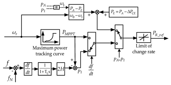 where PR_ref is the reference value of DFIG output active power; PMPPT is the output power in the MPPT curve; and H is the inertia time constant.