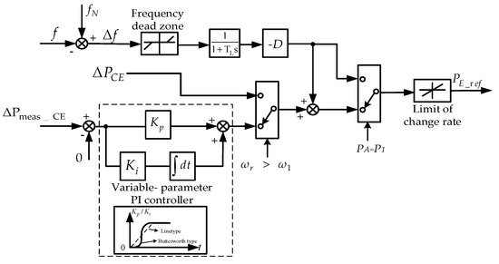 If the output part of the supercapacitor remains constant all the time, the output power of the DFIG will be greater than the power shortage during rotor speed recovery, and it may lead to frequency overshoot. Therefore, the PI regulator link (as shown in Figure 7) is introduced to reduce to 0 slowly and decrease power fluctuation. In the selection of the PI regulator, considering that the constant parameter PI regulator has the problem of output power sudden change, and linear variable parameter PI regulator has the problem that output power is difficult to adjust in time, the variable parameter PI regulator based on Butterworth function was chosen to reduce the impact of the ’s exit. When the rotor speed starts to increase (i.e., ), the ’s actual output value (measured in the supercapacitor outlet) and the reference value 0 are controlled as the input of the PI regulator. By continuously adjusting the PI regulator, the output part of the supercapacitor will be reduced to 0 slowly, and the DFIG will recover to the only stable point A. In this period, the reference value of the supercapacitor output power is shown in (14).