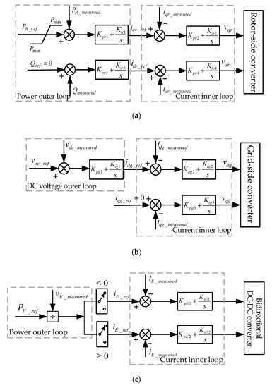 As shown in Figure 1, the supercapacitor is connected to the DC bus between the rotor-side converter (RSC) and grid-side converter (GSC) through the bidirectional DC-DC converter [14,36]. By controlling the DC-DC converter, the supercapacitor can discharge and provide its power to the system through the GSC. For the RSC [37], it adopts the control mode of the power outer loop and current inner loop to realize the effective control of the DFIG output power, and the reference value of active power is shown in Figure 6. For the GSC, it adopts the control mode of the DC voltage outer loop and current inner loop to keep the DC bus voltage stable. For the bidirectional DC-DC converter, its control system includes the power outer loop and current inner loop, which is shown in Figure 8c, and its power reference value is shown in Figure 7.