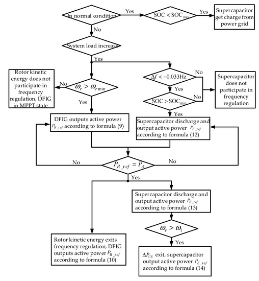 By coordinating the rotor kinetic energy and supercapacitor, it avoids the occurrence of secondary frequency drop, reduces the power loss during rotor speed recovery, and realizes the smooth operation of frequency. The most important is that the DFIG can have an inertia characteristic and droop characteristic like SG. During frequency regulation, the control flow chart of the coordinated frequency control strategy for the DFIG and supercapacitor is shown in Figure 9.