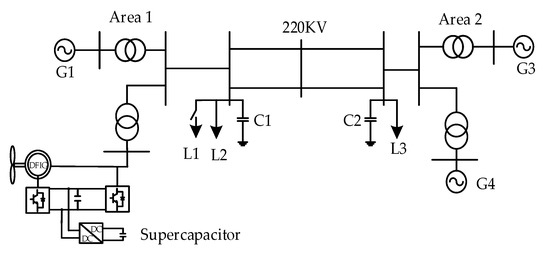 In order to verify the correctness of inertia and droop frequency control strategy based on rotor kinetic energy and supercapacitor, a four-machine and two-area model [38] was built in a MATLAB/ SIMULINK simulation platform as shown in Figure 10. The power supply of area one was composed of a SG with a governor and excitation regulator, and 300 DFIG with an energy storage device. The power supply of area two was composed of two SGs. Load L2 and L3 were fixed active loads of 700 MW and 900 MW, and L1 is a removable load of 700 MW. C1 and C2 were reactive compensation devices. The capacity and control parameters of each power supply in the system are shown in Table A1 of the Appendix A.