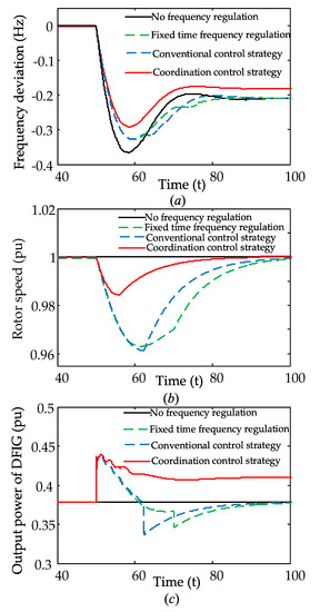 To prove the superiority of the coordinated control strategy proposed in this paper, a case where a load increase event (removable load L1) triggered at 50 s was simulated when the wind speed was 10 m/s. In this case, the value of power dip was determined as 0.016 pu according to Section 4.2. Additionally, the dynamic response results of system frequency, rotor speed, and output power under conventional control strategy, coordinated control strategy, and the DFIG not participating in frequency regulation are shown in Figure 12. Furthermore, in order to verify the influence of the rotor kinetic energy’s power support time, the fixed time frequency regulation strategy based on conventional control strategy was also simulated. The only difference in the fixed time frequency regulation strategy and conventional control strategy was that the rotor kinetic energy’s support time of the former was longer than the latter. As for the power support time of the fixed time frequency regulation strategy, we selected 20 s in this case.