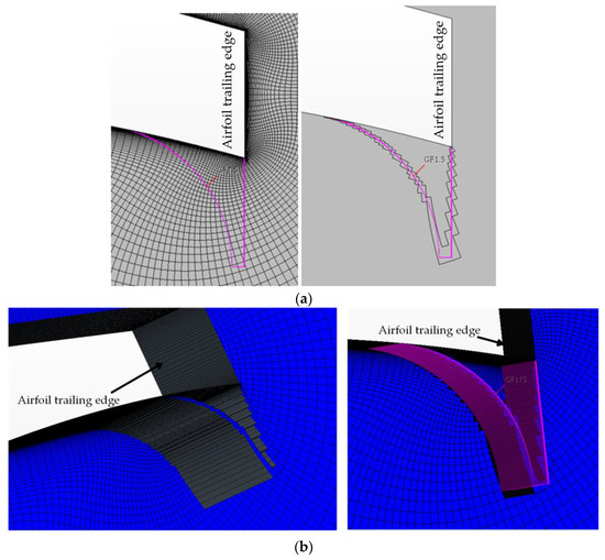 Cell-set construction based on the geometry of a GF: (a) two-dimensional case of a DU91W250 airfoil, equipped with a Gurney flap (GF) cell-set; (b) three-dimensional case of a DU97W300 airfoil, equipped with a GF cell-set (see Figure 3 for an entire airfoil context).