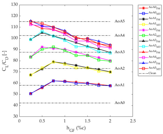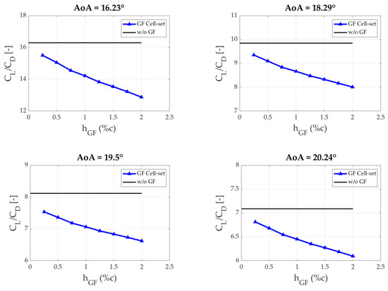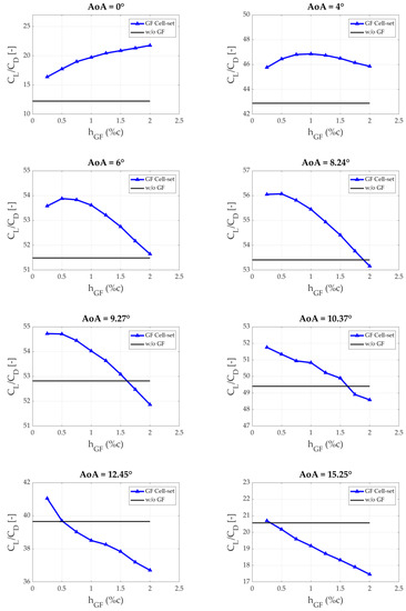 Taking into consideration the curves illustrated in Figure 7, a selection of the optimum GF length for each AoA was carried out. In order to perform the selection, the following criteria were applied: as long as the cell-set curve (blue curve with triangular markers), or a section of it, is on the upper part of the clean line, the maximum calculated value is chosen. Nevertheless, the cases in which the whole cell-set curve is below the clean line (from 16.23° to 20.24° of AoA) are rejected as there is no aerodynamic improvement. In Table 3, the optimum hGF values for each AoA and the CL/CD ratio reached are presented. Additionally, when AoA is close to 0°, longer GFs are requested, and as the AoA increases, lower hGF values are requested in order to achieve the maximum CL/CD ratio.