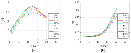 Firstly, CL lift coefficient and CD drag coefficient curves were determined, as is shown in Figure 6. Both plots represent nine different curves in which the dashed-blue line shows the curve formed by a clean airfoil and the eight remaining continuous curves refer to the CL and CD values obtained with each GF length (% of c). A noticeable pattern is created: longer GFs generate higher CL and CD, whereas shorter GFs reach lower values.