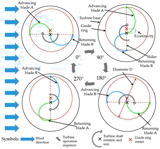 An idea of the novel turbine with a variable geometry of blades is shown in Figure 1 for subsequent phases of the rotor revolution [33]. Shapes of the blades made of a flexible material change constantly during its rotation. This is achieved by guiding the outer edges of the blades (tips marked as dots in the color of the blades) along the guide ring (red) placed eccentrically with respect to the rotor shaft. Rods attached to the outer edges of the blades can move linearly with respect to sliders, which are fixed to the shaft. The rode–slider mechanisms, marked by a red dashed line, are applied at the top and bottom of the turbine and they transfer the torque generated by the blades to the shaft. The inner edges of the blades are also attached to the rotor shaft.