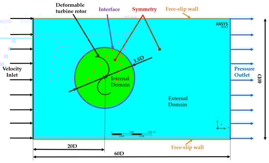 A set of the boundary conditions applied in the simulations is indicated in Figure 2. At the inlet, the velocity of 4 m/s was specified with 1% of the turbulence intensity and the turbulent viscosity ratio equal to 1. This velocity corresponds to the Reynolds number based on the turbine diameter equal to 2.5 × 105. The pressure outlet condition (absolute pressure of 101,325 Pa) was defined at the opposite end of the domain. At the upper and lower surfaces of the domain in Figure 2, a free-slip wall condition was imposed. As the task was solved in a quasi-2D way, the symmetry condition was defined on the side surfaces, perpendicular to the axis of turbine rotation. The motion of the blades was governed in the structural simulation and was transferred to the Fluent solver by system coupling. The blades of the turbine were defined as non-slip and smooth walls. The interface between both domains was applied to exchange data. The initial conditions were determined on the basis of the boundary conditions.