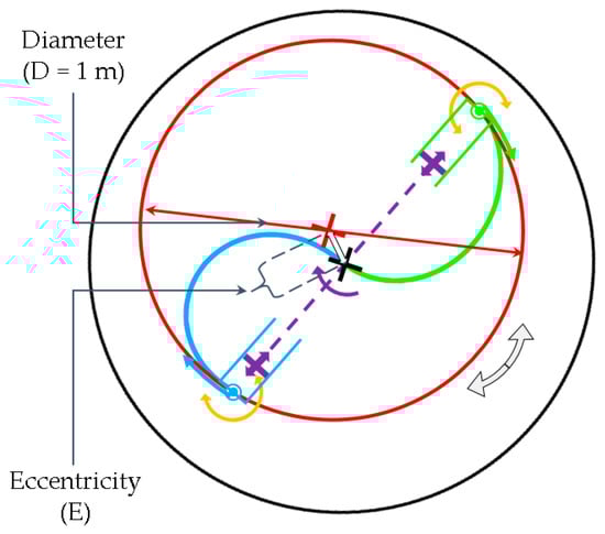 The kinematics of the blades (blue and green arcs) was restricted by several constraints indicated schematically in Figure 3. The turbine shaft rotated around the axis indicated by a black X, where the blades were tangent. Their outer tips marked with green and blue points were constrained by frictionless movement along the guide ring (red circle) as indicated by green and blue arrows. The torque generated by the blades was transferred to the shaft by rode–slider mechanisms. The rode marked with a purple dashed line was fixed to the turbine shaft. The sliders, marked as blue and green cylinders, were connected to the blade tips. The rode–slider mechanisms allowed for frictionless linear movement of the blade outer tips with respect to the axis of rotation, but the mechanisms kept them in the same relative angular position during the turbine rotation. Additionally, the blade outer tips could rotate without friction with respect to the rods as indicated by yellow arrows.