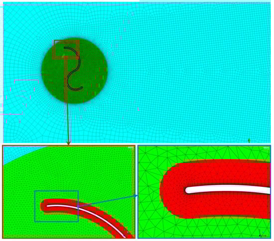 The computational mesh was generated in ANSYS Meshing. Following the mesh dependence test, described in the next subsection, a mesh composed of 1.16 million control volumes was used in the simulations. The external domain did not change during the computational campaign, thus, it was meshed with a single layer of hexahedral elements through the slice. Refinements were applied around the interface with the internal domain and in the wake downstream of the turbine (Figure 4). The internal domain consisted of two regions marked in green and in red. Due to the requirements of the ANSYS Fluent concerning the dynamic mesh options of deformation and remeshing, tetrahedral elements were used in those regions. In order to ensure a high-quality mesh in the region around the blades (marked in red), a highly refined mesh with 12 layers of prismatic elements at the wall was generated. That number of layers was sufficient to satisfy the condition y+ < 1 of the first mesh element at the wall for almost all the simulations. The value was exceeded only for very limited regions at the blade tips. Thus, the mesh was sufficient to solve fully the flow in the boundary layer, which is very important as the flow is characterized by numerous boundary layer separations, especially at convex sides of the blades. Refinement of the mesh around the blades (especially at their tips) caused the number of elements through its width to be increased to two and even four elements at the blade tips in this region of the domain. In order to avoid numerical errors, the sizes of elements at the interface between the outer and inner domains did not differ significantly.