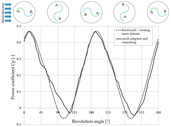 In the case of the simulations with mesh deformation and remeshing applied in the further investigations, such a limit cycle was not obtained, mostly due to numerical instabilities. They resulted from the continuous deformation of mesh control volumes, which successively deteriorated in quality up to the moment when the specific regions were remeshed. Remeshing introduced some further numerical errors due to the data interpolation onto a new mesh. Thus, slight random fluctuations of the blade load were present. Therefore, the data presented in Figure 5 with a solid line were averaged for the last 5 out of 15 rotor revolutions. This number of periods was sufficient to reach no significant changes of the data averaged for the same angular positions during the rotor revolution. The period-averaged values of the power coefficient changes were lower than 1% after 10 revolutions.