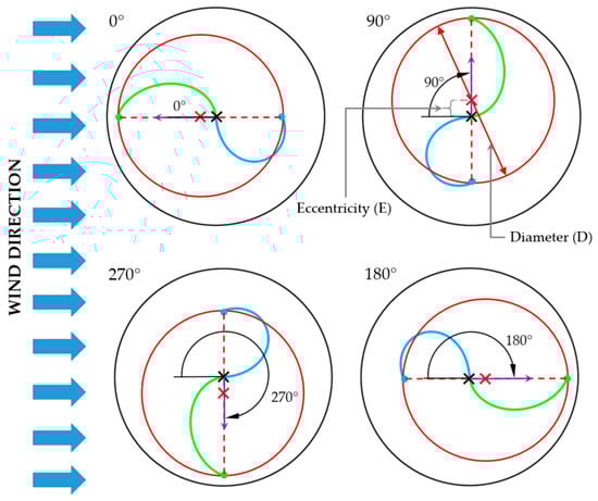Numerical simulations of the air flow in the Savonius rotor with deformable blades were carried out for different magnitudes of eccentricity and different angular positions of the eccentricity line with respect to the direction of the incoming wind. The eccentricity magnitude E was defined as a distance between the axis of turbine rotation (marked with a black X in Figure 6) and the center of the blade tip trajectory (marked with a red X), whereas the eccentricity line connects these centers. Selected angular positions of the eccentricity line marked by purple arrows are shown in Figure 6. The rotor blades are presented for their highest deformation. Three magnitudes of eccentricity E = 50 mm (the ratio of eccentricity to the guide ring diameter E/D = 5%), 100 mm (10%) and 150 mm (15%) were investigated for the whole 360° range of angular positions of the eccentricity line with respect to the direction of the incoming wind.
