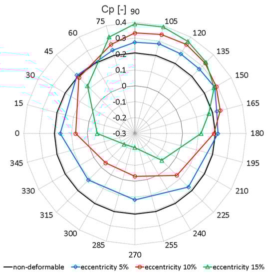 The polar plot of the power coefficient distribution is shown in Figure 7, where data markers indicate all the simulations performed. The black line in the figure indicates the case with a non-deformable rotor. The aim of the investigations was to find the optimal eccentricity position. Therefore, the initial screening calculations were performed with eccentricity changes every 45°. Then, the additional calculations were conducted for the range of 75–180°. In every case 10 revolutions were simulated and average values of the power coefficient out of the last three revolutions were calculated and shown in the figure. Finally, for the position of 105°, an additional 5 revolutions were simulated to determine more precisely the average values for further analysis. However, no significant difference (less than 2%) of the averaged pressure coefficient was obtained with respect to the previously obtained value.