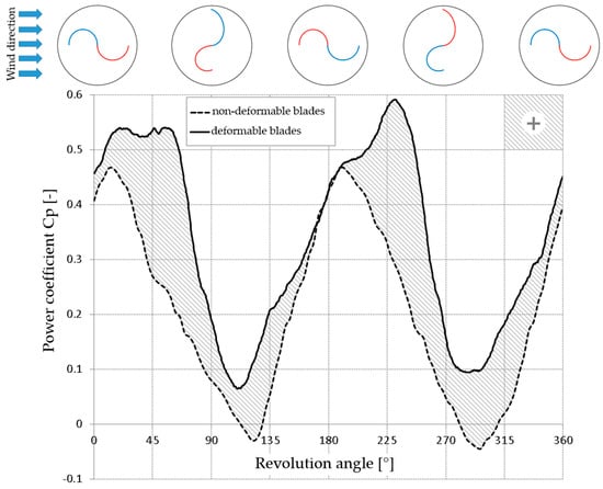 Comparison of the averaged values of the power coefficient Cp for one revolution of the rotors with non-deformable and deformable blades. Subsequent positions of the turbine illustrated in the schemes above the graph correspond to the turbine revolution angle.