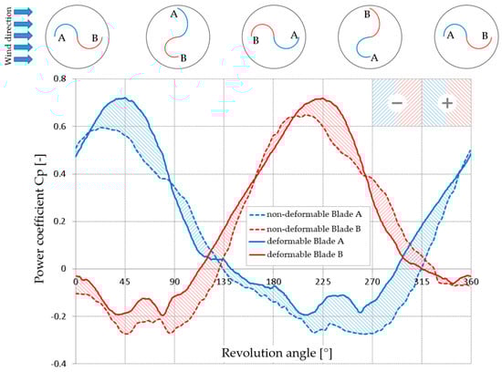 Changes in the power coefficient during one revolution of the rotors for deformable blades and non-deformable blades are presented in Figure 8. They are sums of contributions of the individual blades shown in Figure 9. The hatched areas between deformable and non-deformable blade lines in both figures indicate positive (+) or negative (−) effects of deformable blade geometries onto the power coefficient readings. Both blades were analyzed separately for better understanding of the occurring phenomena. Blade A is marked blue and Blade B is indicated by red lines in Figure 9. Small changes can be distinguished between characteristics for each blade of the particular rotor type. They resulted from not fully repeatable loads of each blade due to random structures influenced by numerical errors (mesh deformation and remeshing). Still, 5 rotor revolutions selected for data averaging seem to be sufficient to reveal differences between the deformable and non-deformable rotors.