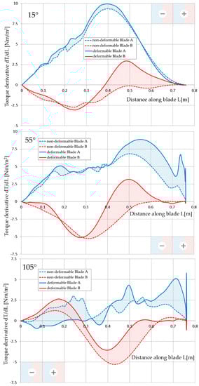 In order to better understand the contribution of the particular blade loading to the torque generation, torque distributions along the blades (from the axis towards the blade tips) are shown in Figure 10 and pressure fields in Figure 11, correspondingly. The dT/dL derivative per 1 m of the blade span (actually it is ΔT/ΔL as it is based on the finite volume simulations) is shown in Figure 10, thus, in order to obtain the torque value, this parameter needs to be integrated along the blade. Three particular instants of the rotor revolution were selected (15°, 55° and 105°), which is sufficient to display the main differences between the rotors with deformable and non-deformable blades. The data were presented for a half of the cycle, because no significant differences can be distinguished for its second part. The data in Figure 10 and Figure 11 are attained for the 10th rotor revolution, thus there is no perfect agreement with the results in Figure 9 obtained from averaging over 5 revolutions. Animations of changes in parameters for one rotor revolution are presented in Supplementary Materials (Video S1 presents the non-deformable rotor, whereas Video S2 shows the deformable one).